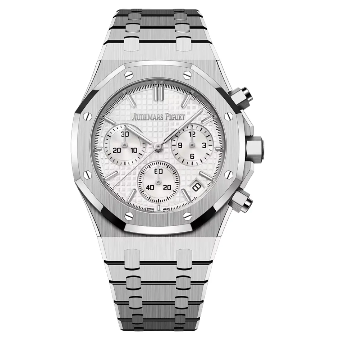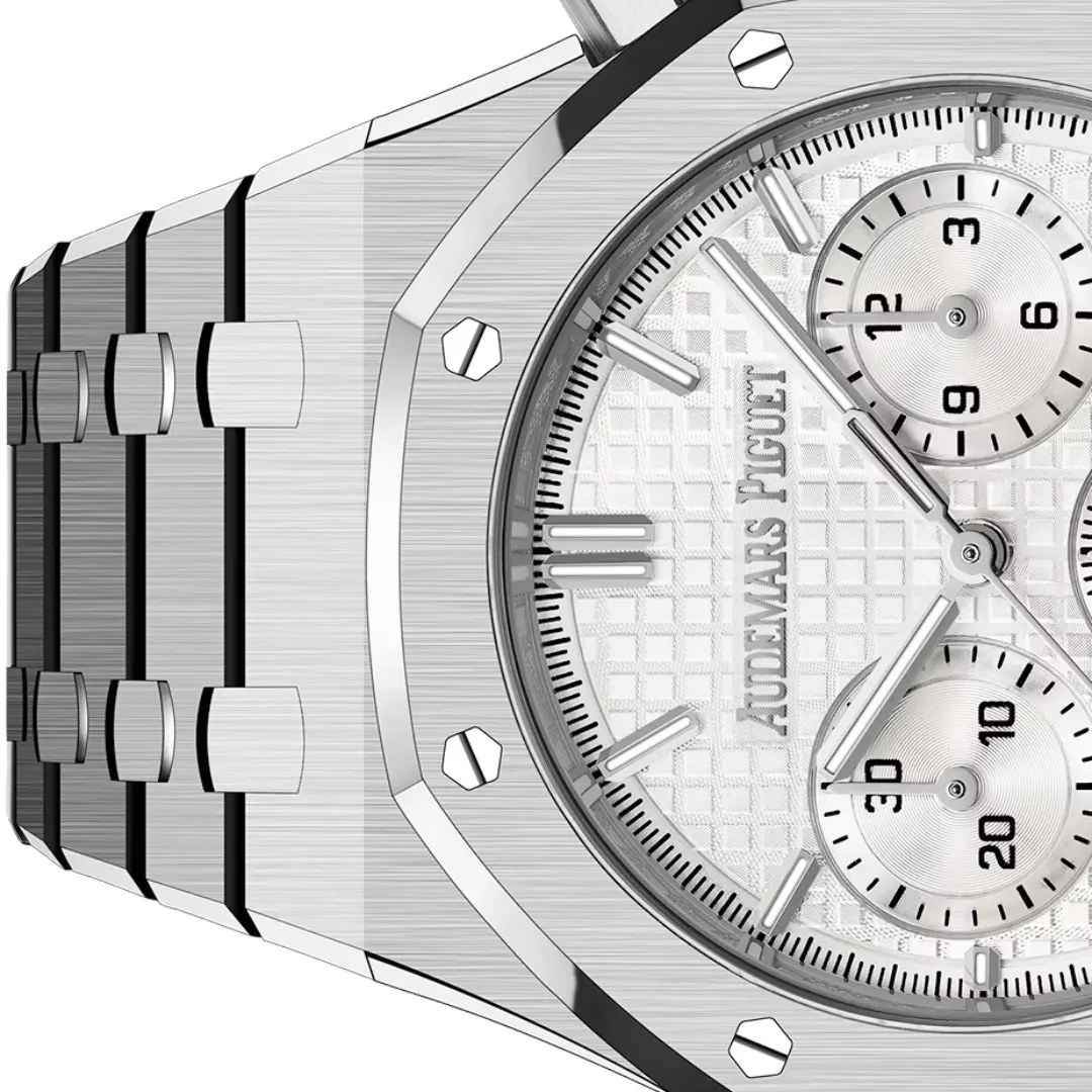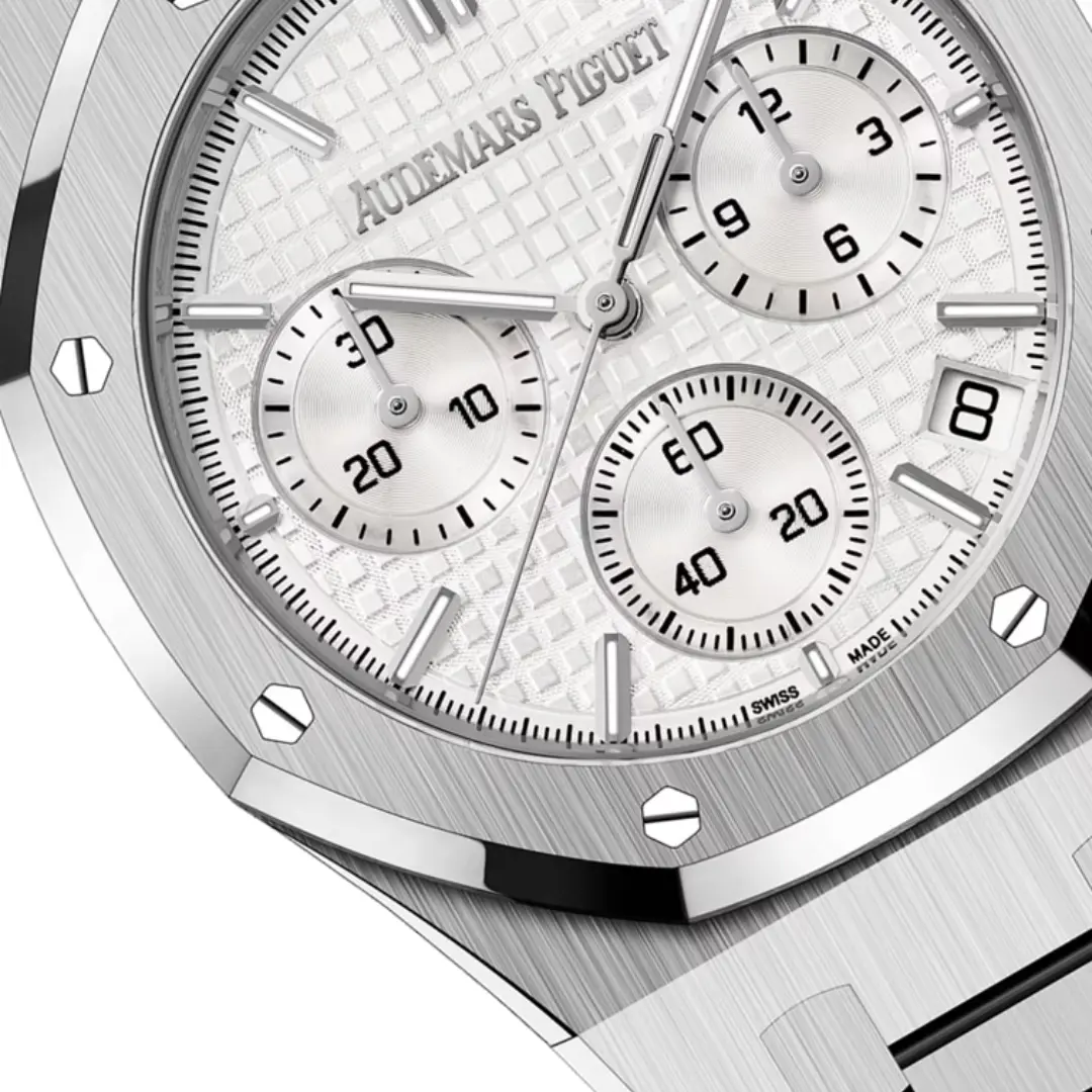 The watch features a silver-toned “Grande Tapisserie” dial, a hallmark of the Royal Oak collection. The textured pattern adds depth and character while maintaining a clean, elegant appearance. Applied white gold hour markers and Royal Oak hands are filled with luminescent material, ensuring excellent legibility in low-light conditions. The chronograph sub-dials are harmoniously integrated, preserving balance and symmetry across the dial.