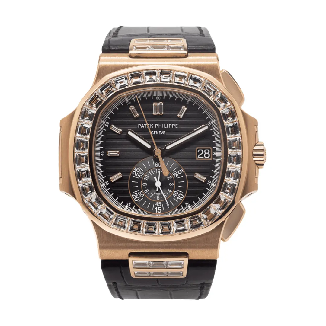 A rare and luxurious special-edition Nautilus crafted in solid rose gold and fully set with premium diamonds, featuring the signature blue dial and the high-performance automatic chronograph calibre.